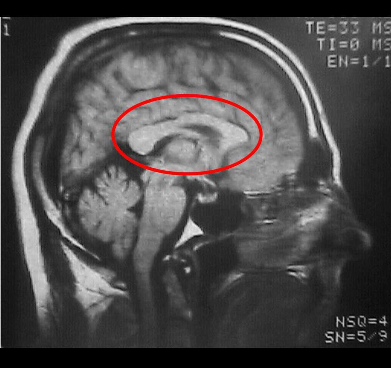 This image shows a healthy brain with the corpus callosum present—connecting the left and right sides of the brain.