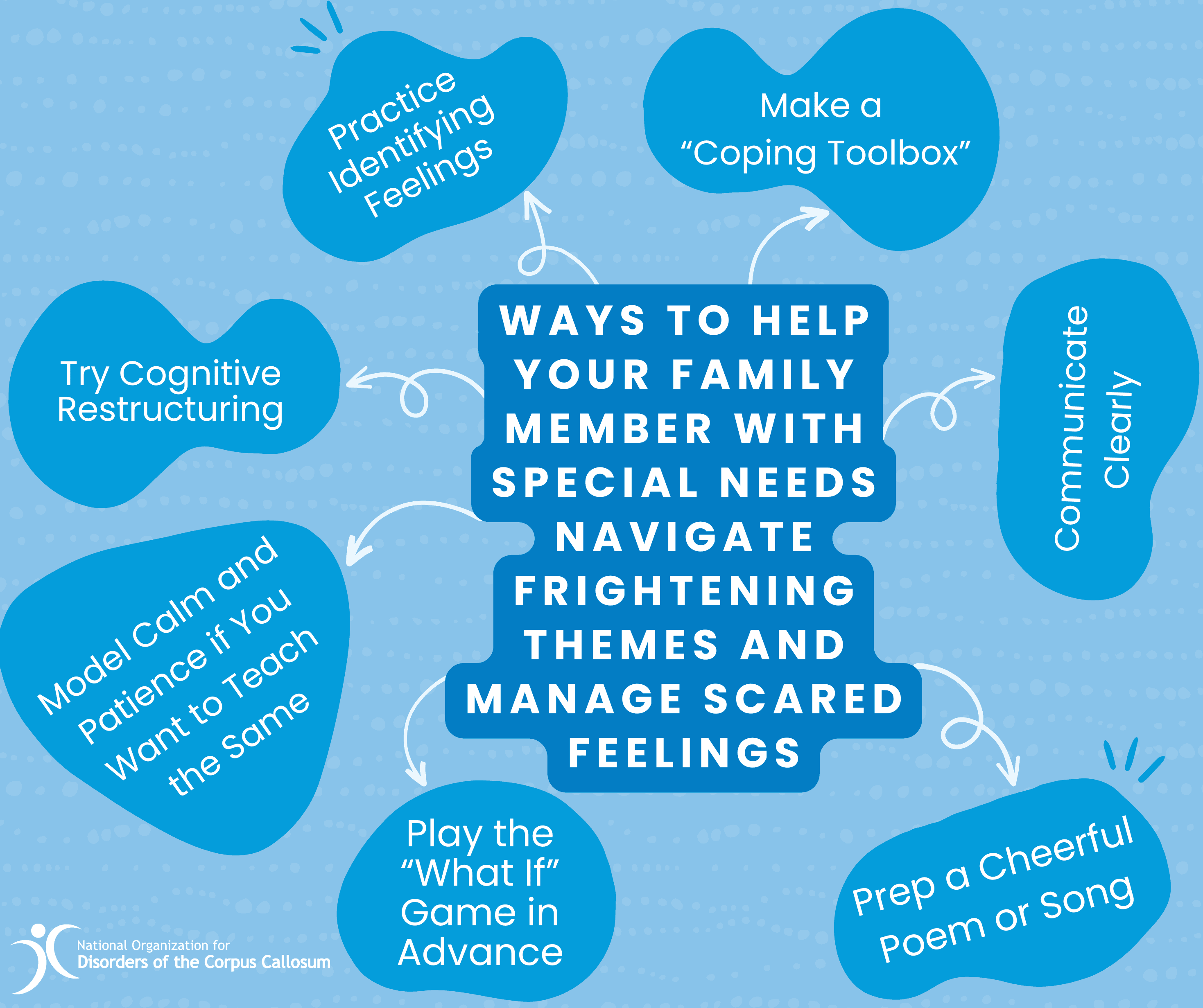 - Try Cognitive Restructuring: Cognitive restructuring is a three-step process that helps change how we think. 1. Identify the Negative Thoughts: Teach your loved on to recognize and articulate fear-inducing thoughts. Start by coaxing them to express the exact nature of their fear with open-ended questions. Example: After a spooky family movie night, young Sam tells his mom, “There are monsters under my bed!” It’s our job now to ask quality questions to understand: “What thoughts come to your mind when the lights go off?” Sam says, “I think there’s something hiding that will get me.” 2. Challenge Those Thoughts: Encourage your loved one to doubt that their negative, fear-based idea is actually not true. For example: Sam’s mother asks, “Have we ever found anything scary in the dark before? Could it be that we saw a movie and your mind is thinking about those things? Can we maybe turn on a night light and look together?” 3. Replace with Positive Thoughts: Guide your loved one to reframe their fears with a positive or neutral perspective. Example: Together, Sam and her mother came up with a new thought: “I am safe.” “The dark is just like the daytime, but with the lights off.” “I have my night light if I feel scared.”